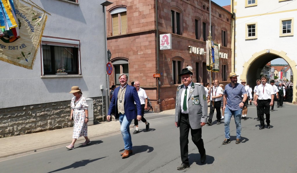 Der Sonntag begann mit einer sehr gut besuchten Hubertusmesse, die Pfarrer Krämer und die Karlstädter Jagdhornbläser zu einem Ereignis machten. Begleitet von der Zellinger Blaskapelle ging es dann direkt zum Frühschoppen über bevor jeder die Qual der Wahl beim reichhaltigen Speisenangebot hatte. Der Nachmittag wurde mit einem traditionellen Festumzug vom Spätzplatz bis zum Schützenhaus begonnen. Dieser bestand aus rund 500 Teilnehmern von Ortsvereinen aber vor allem aus Schützenvereinen der Umgebung. Nach dem Festumzug ging es mit Grußworten unseres Schützenmeisters Michael Koblinger, des Gau Schützenmeisters Axel Höfler, dem Bezirksschützenmeisters Mathias Dörrie, unserem Bürgermeister Stefan Wohlfahrt sowie dem MdL Thorsten Schwab weiter. Als Nächstes folgte die Ehrung von Horst Reuchlein und Bernd Volkenstein für 50 Jahre Mitgliedschaft im DSB und BSSB. Zum Abschluss des offiziellen Teils fand die Preisverleihung des Gau-Schießens mit Proklamation der neuen Gau-Schützenkönige statt. Den restlichen Sonntag gestalteten die Binsfelder Musikanten bis weit in die Nacht hinein.